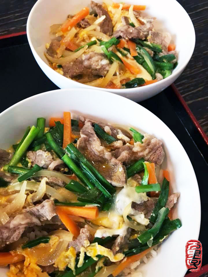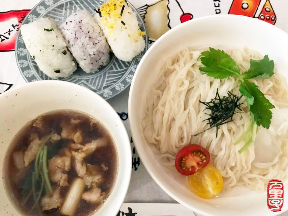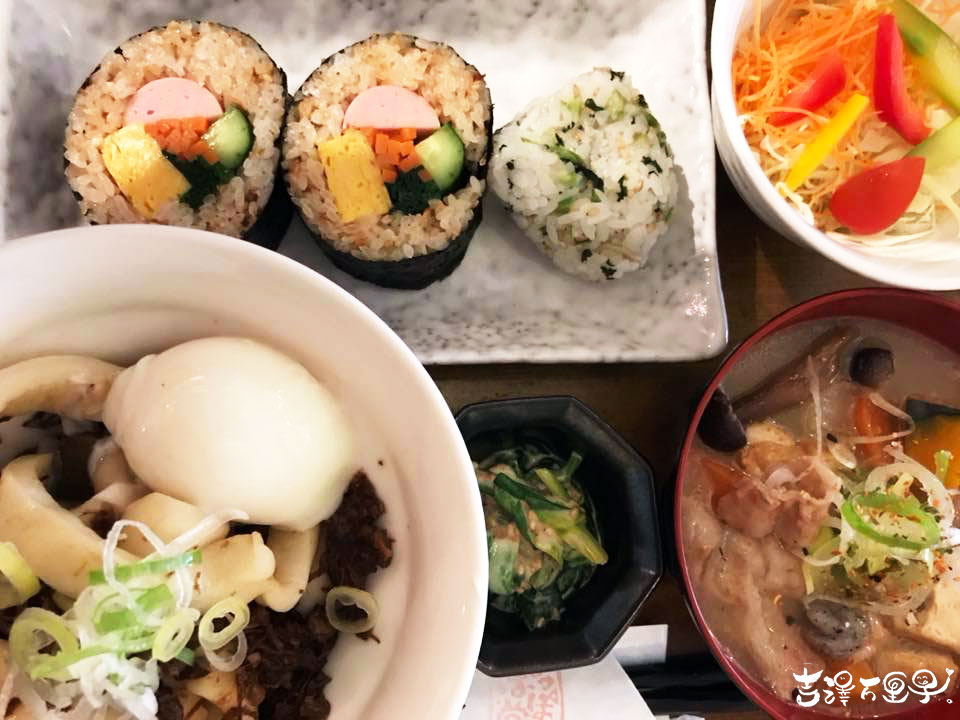 牛すじ温玉うろんと韓国風海苔巻きと青菜おむすび。と …