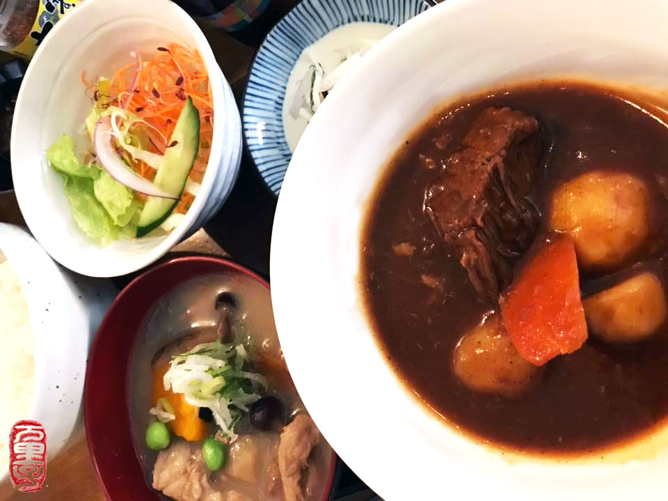 牛すじ煮込み定食と豚汁にゅうめん。600円。 Gy …