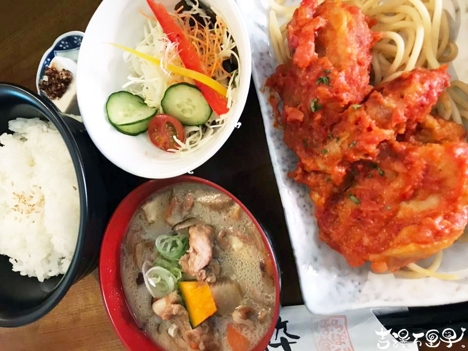 ハムチーズとんかつのせとんとんピラ定食。大きな貝汁 …