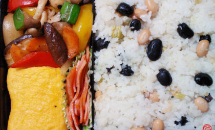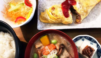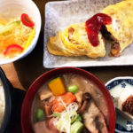 牛すじ温玉うろんと韓国風海苔巻きと青菜おむすび。と …